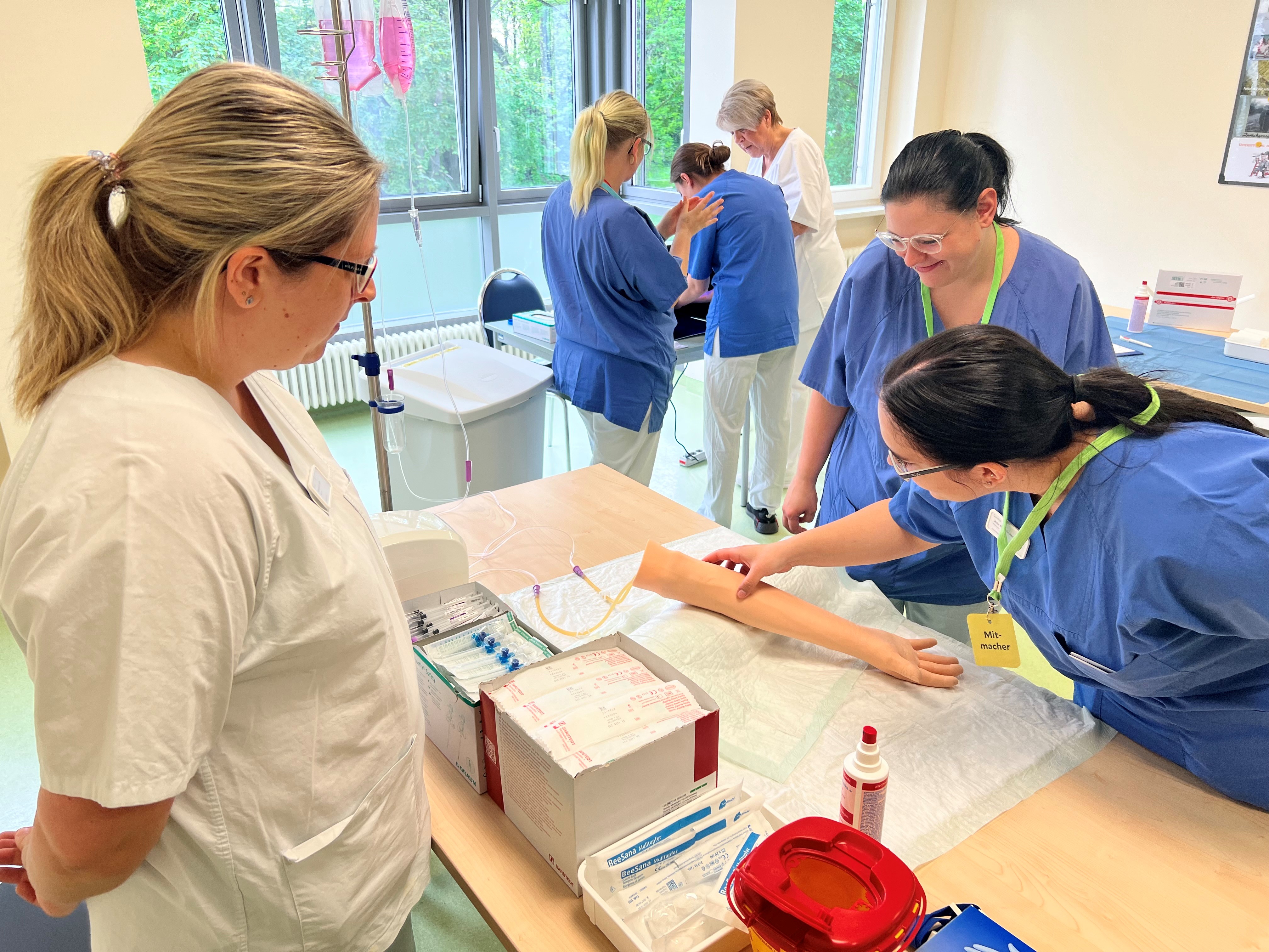 Neben dem Detektivspiel im Fehlerraum konnte an drei Stationen vor den Zwischenprüfen das Blutabnehmen, der Verbandswechsel und die Händehygiene praktisch geübt bzw. aufgefrischt werden. Zu Beginn des Aktionstages überreichte die Klinikleitung der Station und den Praxisanleitern der Schülerstation zum einjährigen Jubiläum standesgemäß eine Torte sowie eine Überraschung.