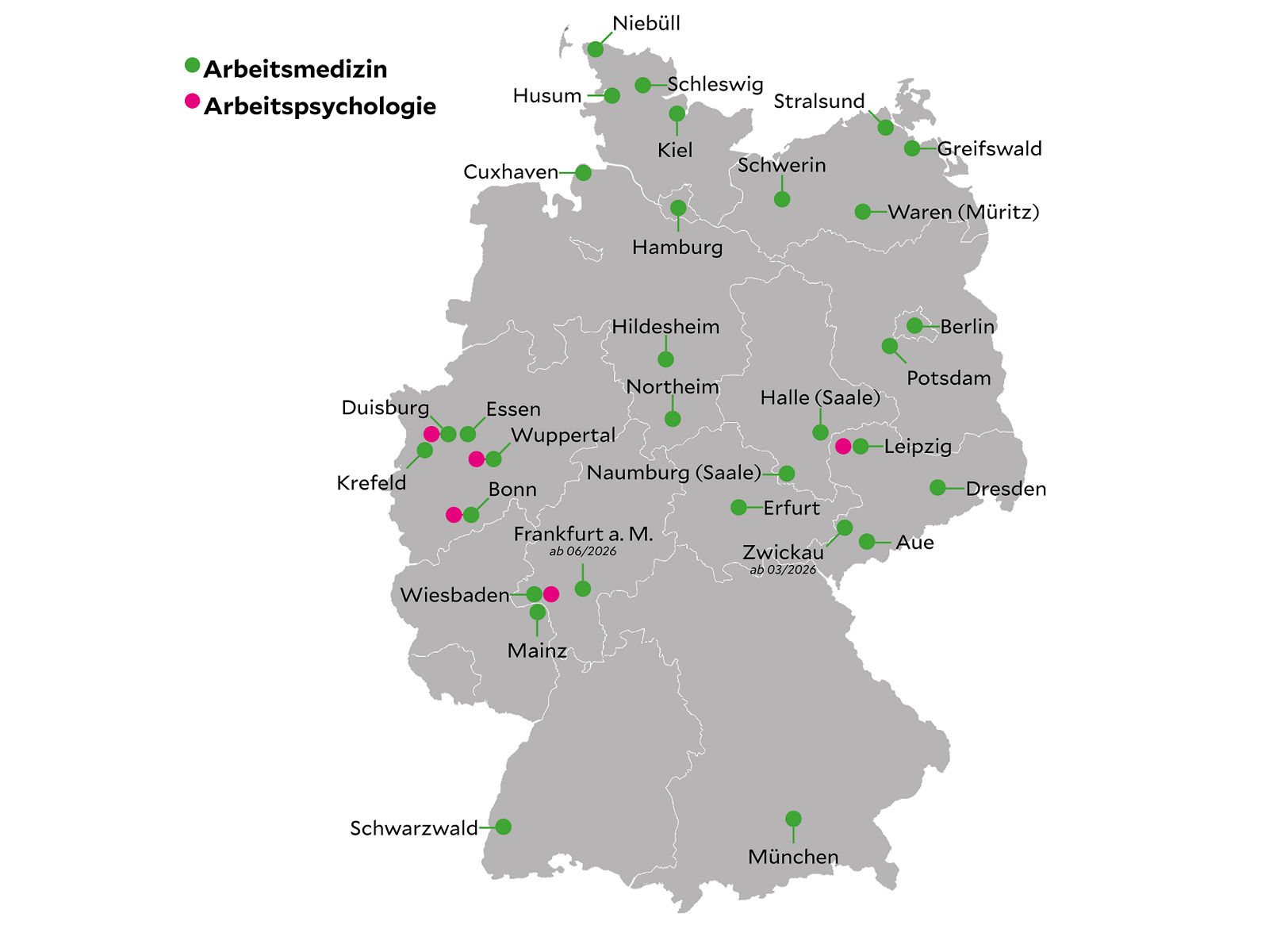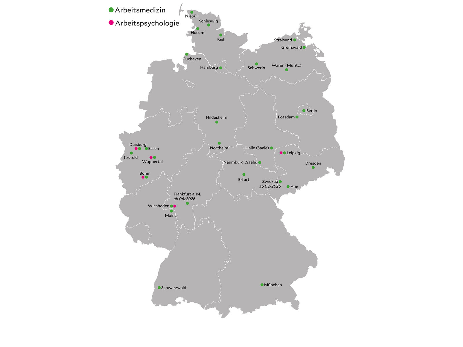Hier finden Sie alle Standorte der Helios Arbeitsmedizin im Überblick. Mit Klick auf einen der Standorte erhalten Sie Informationen über die Ansprechpartner und Kontaktmöglichkeiten des entsprechenden Standorts.