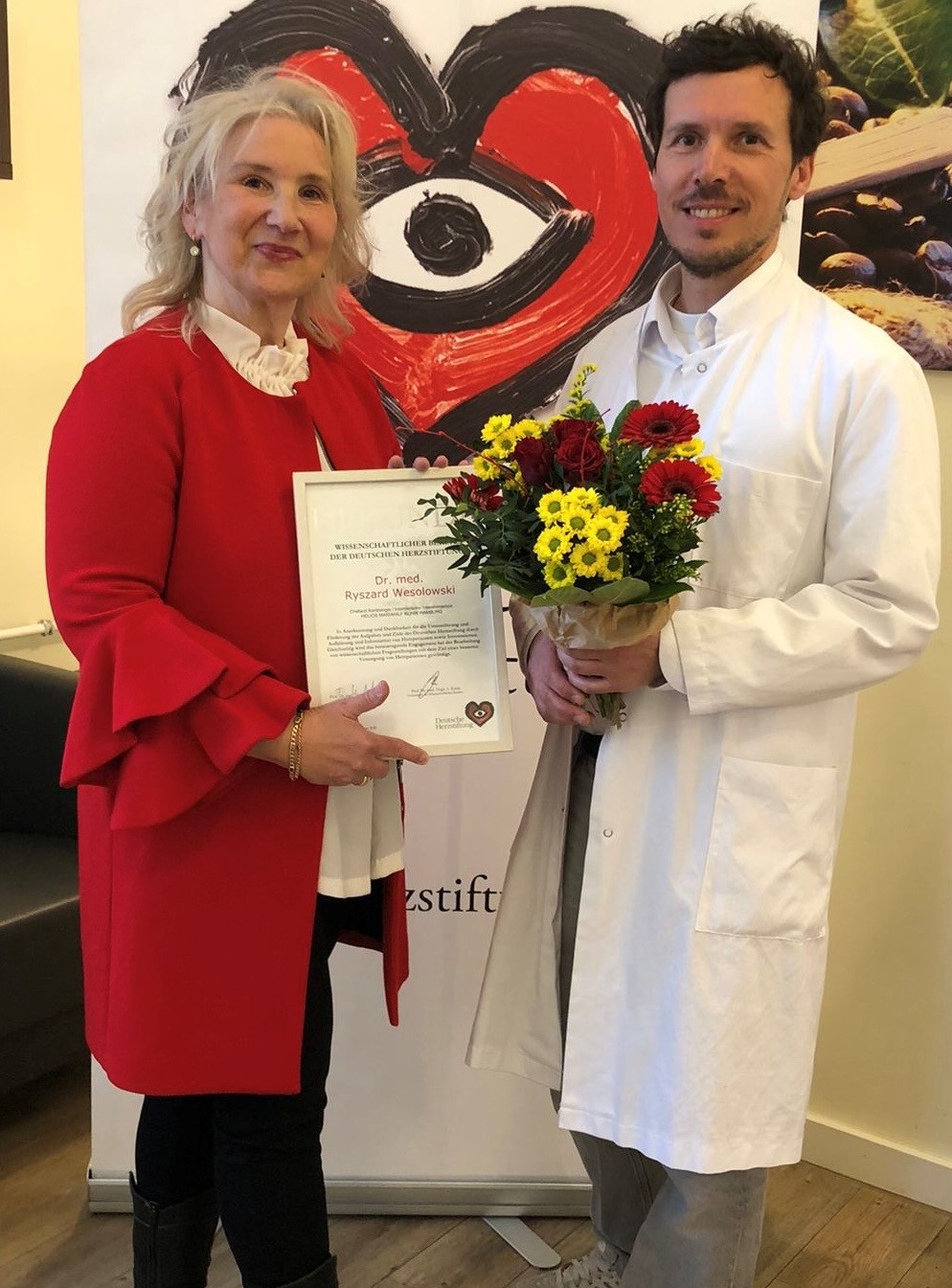 Die Berufungsurkunde in den Wissenschaftlichen Beirat der gemeinnützigen Organisation überreichte Cornelia Hoffmann, ehrenamtliche Beauftragte der Deutschen Herzstiftung, persönlich in der Helios Klinik Mariahilf an Dr. Wesolowski.